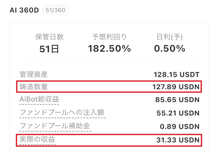 元本127.89 USDNに対して+31.33 USDNの収益(約24.5%増)を達成。